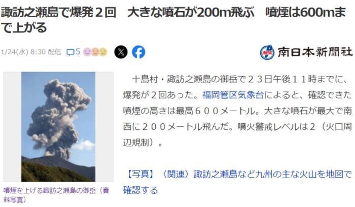 福岡管區(qū)氣象臺發(fā)布消息稱,噴出的煙柱最高達(dá)600米,巨大的火山石向外飛出200米。目前,當(dāng)?shù)匾呀?jīng)將火山噴發(fā)警戒提高到2級,火山口周邊區(qū)域禁止入內(nèi)。