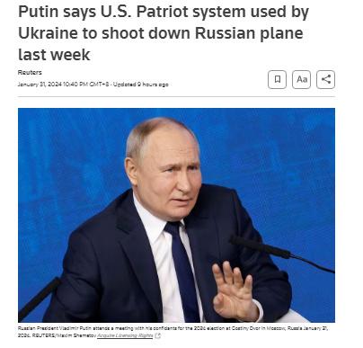 中新網(wǎng)2月1日電 據(jù)路透社報道,俄羅斯總統(tǒng)普京當(dāng)?shù)貢r間1月31日表示,俄方確認(rèn)此前載有被俘烏克蘭軍事人員的俄伊爾-76軍用運(yùn)輸機(jī)是被美制“愛國者”導(dǎo)彈系統(tǒng)擊落。