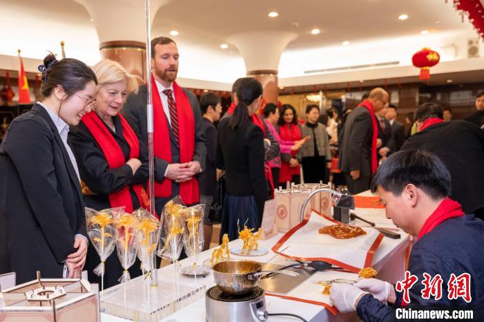招待會上,來自浙江省的工藝美術大師和非遺傳承人精心準備了各具特色的中國非遺和年俗互動項目,來自美國西北大學的音樂家演唱了激情澎湃的《為祖國干杯》和熱鬧喜慶的《龍船調(diào)》。來賓們紛紛表示,期待新的一年繼續(xù)與中國攜手努力,建設更美好的世界。(完)