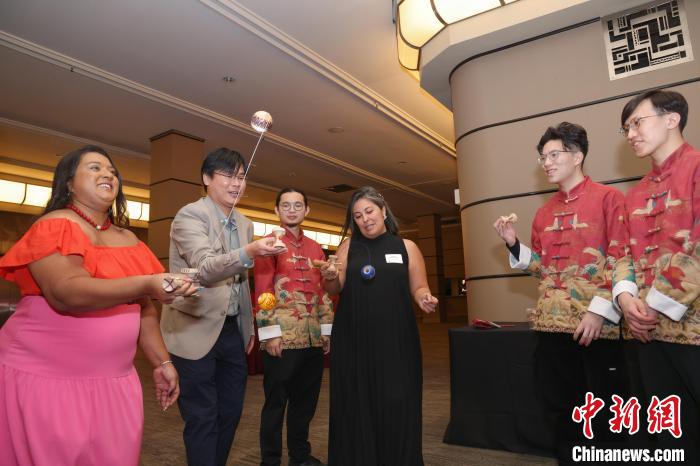 2月8日,曾在香港和國際賽事中屢獲殊榮的香港劍球(亦稱劍玉)隊(duì)成員(著唐裝者)獲香港駐多倫多經(jīng)貿(mào)處邀請?jiān)L加并出席新春酒會(huì)時(shí),指導(dǎo)與會(huì)嘉賓體驗(yàn)劍球?!≈行律缬浾?余瑞冬 攝