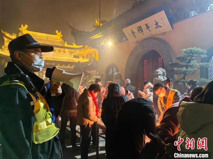 “太平禪寺零點(diǎn)前后達(dá)到瞬時(shí)人流高峰,人流量接近往年峰值人數(shù)的兩倍?!鄙虾J泄簿謱毶椒志诸櫞迮沙鏊L(zhǎng)何相俊說(shuō)。位于上海市寶山區(qū)太平禪寺的龍年撞鐘、燒頭香等活動(dòng),吸引了大量市民前來(lái)進(jìn)香。為應(yīng)對(duì)2月9日晚至2月10日凌晨的短時(shí)大客流,顧村派出所在寺廟入口處增設(shè)了蛇形緩沖通道,預(yù)計(jì)可同時(shí)容納500人以上有序排隊(duì)入寺。