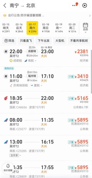 另外,如果條件允許,錯峰返程也是個好辦法。例如,從哈爾濱到北京,17日機(jī)票最低需要6000多元,但如果選擇19日回,機(jī)票價(jià)格降到1500元左右,直接省下4000多元。同樣的情況也發(fā)生在哈爾濱到上海、三亞到重慶等航線上。