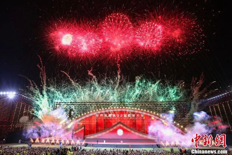 圖為世界客屬第32屆懇親大會(huì)開幕式文藝晚會(huì)現(xiàn)場(chǎng)的焰火表演。劉力鑫 攝