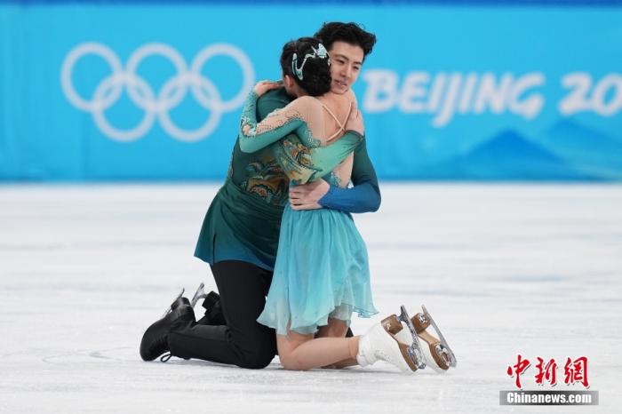 北京冬奧會花樣滑冰冰上舞蹈自由舞比賽賽后,王詩玥/柳鑫宇跪地相擁。(資料圖)中新社記者 崔楠 攝