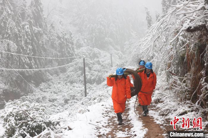 2月8日,國網(wǎng)浙江電力援湘搶險(xiǎn)隊(duì)員前往平江縣開展搶修作業(yè),扛運(yùn)搶修物資?!±盥勎?攝