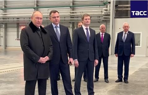 當(dāng)?shù)貢r(shí)間2月21日,俄總統(tǒng)普京視察喀山飛機(jī)制造廠。圖片來(lái)源:塔斯社視頻截圖