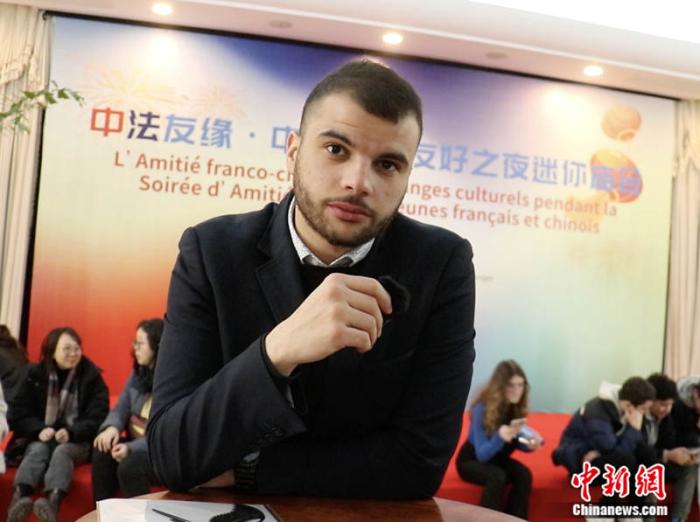 法國(guó)人民援助會(huì)全國(guó)委員會(huì)委員、本次青年代表團(tuán)團(tuán)長(zhǎng)朱利安·維蘭(Julien Villain)接受中新網(wǎng)記者采訪。中新網(wǎng)黃方 攝