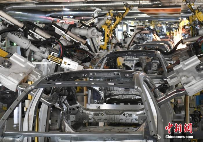 資料圖:正在焊裝的新能源車架。 中新社記者 王剛 攝