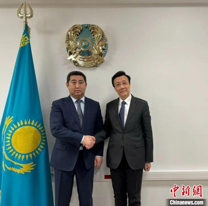當?shù)貢r間3月4日,大使張霄(右一)會見哈農(nóng)業(yè)部長薩帕羅夫。中國駐哈薩克斯坦大使館供圖
