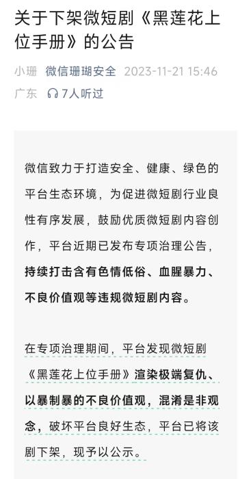 然而,良莠不齊一直是微短劇的行業(yè)痛點(diǎn)。2023年11月,《黑蓮花上位手冊》上線一周之內(nèi)被平臺(tái)下架。