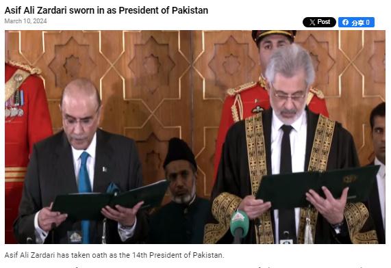 報道稱,扎爾達里曾是“巴基斯坦第一位民選總統(tǒng)”,這次是他第二次當(dāng)選巴基斯坦總統(tǒng)。