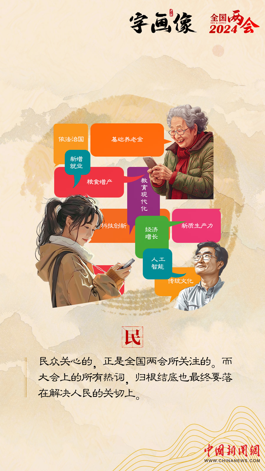“兩會(huì)熱詞”折射著民聲民意,反映著人民群眾對(duì)美好生活的向往和憧憬,承載著老百姓對(duì)各項(xiàng)工作的期待與希冀,我們嘗試以字入畫,通過(guò)九個(gè)漢字的漫畫像,梳理全國(guó)兩會(huì)報(bào)道中的熱詞,以期一窺民生脈搏,了解百姓關(guān)切。