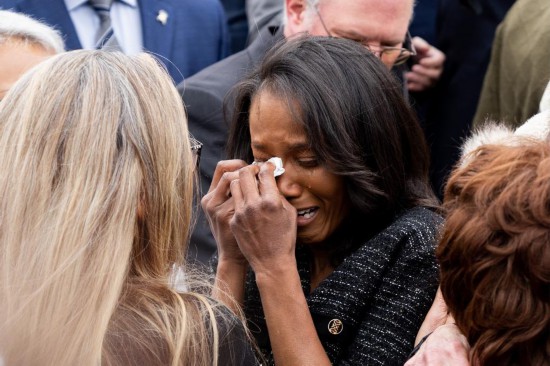 2023年1月6日,在美國首都華盛頓的國會大廈外,一名前國會警察遺孀在紀(jì)念“國會山騷亂”兩周年紀(jì)念儀式上流淚。新華社記者 劉杰 攝