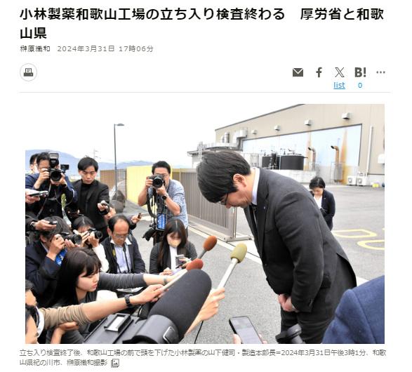 當天上午,日本厚生勞動省及和歌山縣政府相關部門共計17名工作人員,開始對小林制藥公司在和歌山縣的工廠進行檢查。