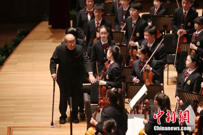 音樂(lè)會(huì)的尾聲,99歲高齡的中國(guó)著名指揮家曹鵬在長(zhǎng)達(dá)一分半的掌聲中登上指揮臺(tái)。