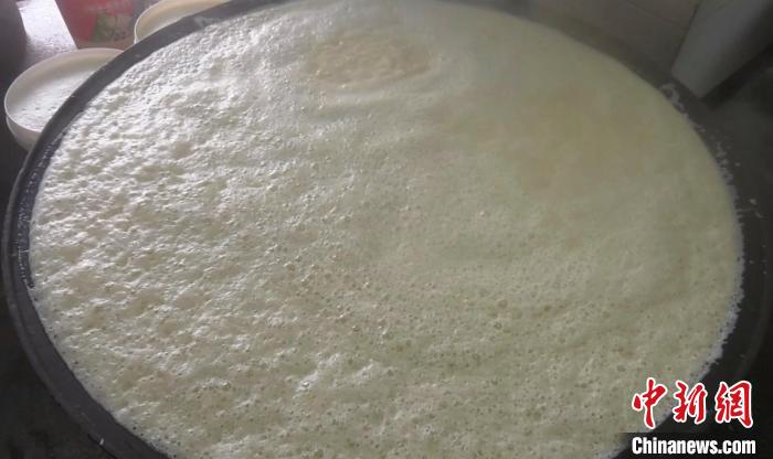 煮豆?jié){時,一口可以裝滿200公斤豆?jié){的鐵鍋,被一點點地裝滿,綿密的泡沫溢滿了整個鐵鍋,爐灶中的柴火通過燃燒散發(fā)出獨有的清香。