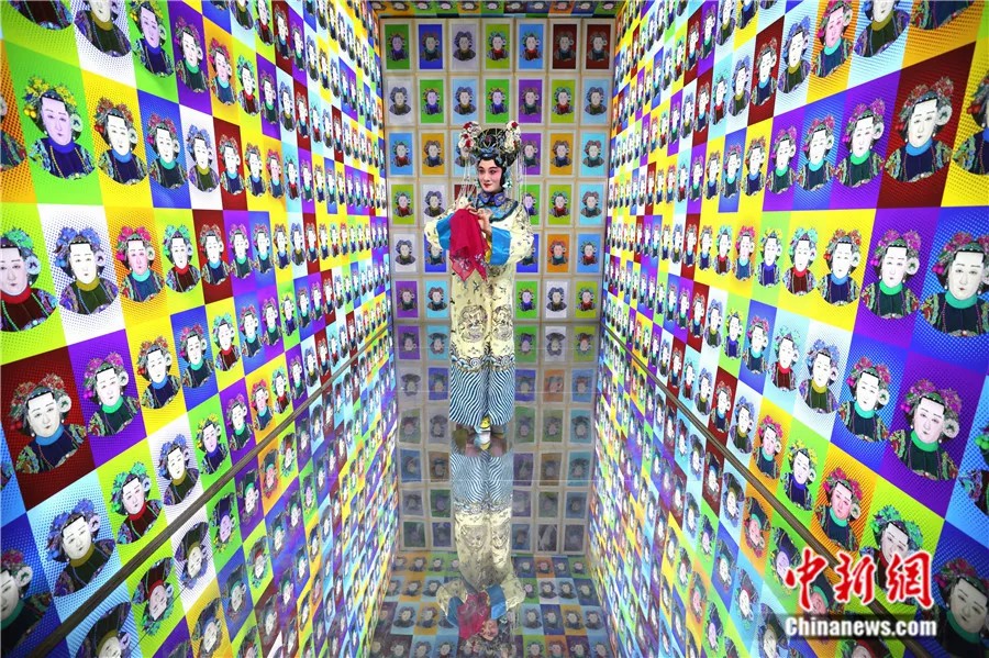 在2022年中國國際服務貿易交易會上,經過數字技術再創(chuàng)作的戲劇人物形象,吸引一名京劇演員駐足。趙雋 攝