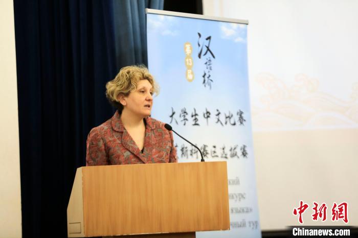 4月12日,莫斯科國立語言大學(xué)副校長古謝茵諾娃出席第十三屆全俄“漢語橋”大學(xué)生中文比賽莫斯科賽區(qū)選拔賽并致辭。(中新網(wǎng)記者 田冰 攝)