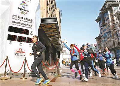 昨天,在位于王府井百貨大樓前的北京2022冬奧會倒計時牌前,除了拍照外,市民還通過各種“個性打卡”方式慶祝新年的到來。圖為前來“打卡”的清華MBA健跑俱樂部的隊友們從倒計時牌前跑過。