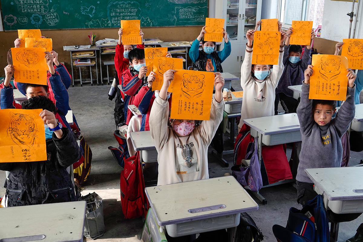 1月7日,山西省運城市新絳縣澤掌鎮(zhèn)光村小學(xué),絳州木版年畫工藝師們帶著新創(chuàng)作的虎年生肖虎木版走進校園,同小學(xué)生們一起印制生肖虎年畫,傳承非遺民俗。