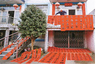 “和順一門有百福 平安二字值千金”……1月13日上午,在寧波寧海縣黃壇鎮(zhèn)永聯(lián)村村民王光彬家中,房間里飄散著濃濃的墨香,幾百副春聯(lián)鋪天蓋地,從墻上蔓延到地上,掛得密密麻麻。
