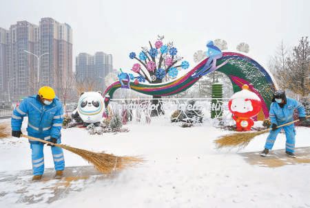 昨天,京城再度飄雪,在東六環(huán)西側(cè)路冬奧主題花壇附近步道上,環(huán)衛(wèi)工在清除步道積雪。本報記者 方非攝