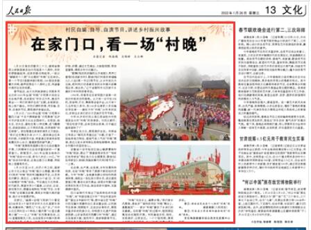 1月25日至26日,農(nóng)歷小年之際,國家公共文化云推出“村晚”接力云展播,集中展示《我的“村晚”我的年》融媒體節(jié)目,以及來自內(nèi)蒙古、黑龍江、上海等20個(gè)省(區(qū)、市)的30場精彩“村晚”活動。節(jié)目通過文化傳承、時(shí)代新風(fēng)、展望未來3個(gè)篇章,以訪談、互動、游戲等方式,展播各地特色“村晚”節(jié)目、分享“村晚”臺前幕后故事、展現(xiàn)鄉(xiāng)村振興美好畫卷、推介鄉(xiāng)村美景好物。
