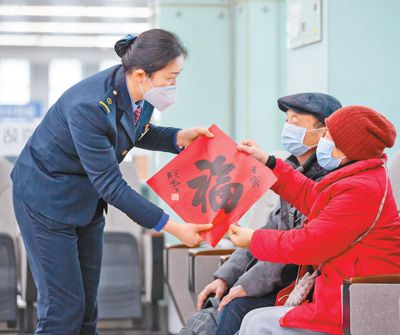 春運(yùn)期間,南京火車站從細(xì)節(jié)著手、小事出發(fā),推出了一系列溫馨服務(wù)。“158”雷鋒服務(wù)站購置一批適合兒童使用的口罩,教孩子們?nèi)绾握_佩戴,同時(shí)為乘車旅客送上春聯(lián)、窗花或“福”字。圖為“158”雷鋒服務(wù)站客運(yùn)值班員為旅客送上新春祝福。