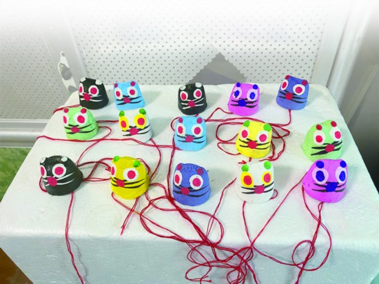 記者看到,吳為民的老伴王培珍拎起兩只系著紅繩的“皮老虎”,熟練地倒置在顏料桶中,等到其身體全部浸沒,立刻拿出,迅速掛在旁邊細(xì)長的竹竿上,三四天之后,方能上畫。只見王培珍在模型上用自制毛筆畫了起來,不一會(huì)兒,“皮老虎”胡須就出來了,最后用紅、白顏料分別點(diǎn)出“皮老虎”的眼白、眼珠和耳朵,一只活靈活現(xiàn)的老虎就畫成了。