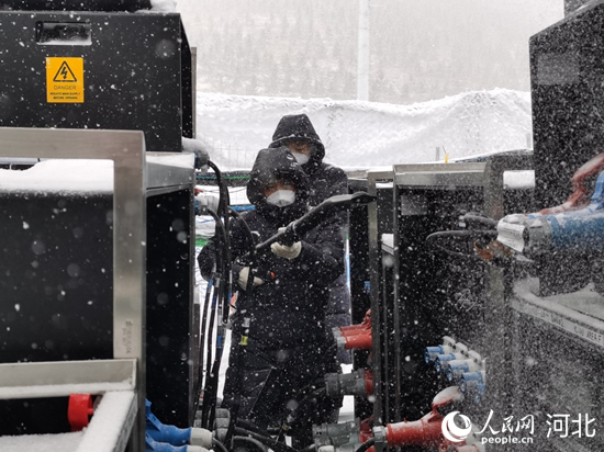 暴雪中,國網(wǎng)冀北電力場館電力保障隊員來到云頂滑雪公園巡視供電設(shè)備。 欒志成攝