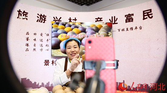 遷安市山葉口村村民劉海霞正在通過(guò)村史館里的“百姓直播平臺(tái)”銷(xiāo)售板栗餑餑等特色農(nóng)產(chǎn)品。 康永利攝
