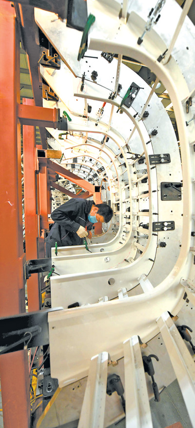 河北石家莊一家大型裝備制造企業(yè),技術人員在裝配飛機發(fā)動機短艙。