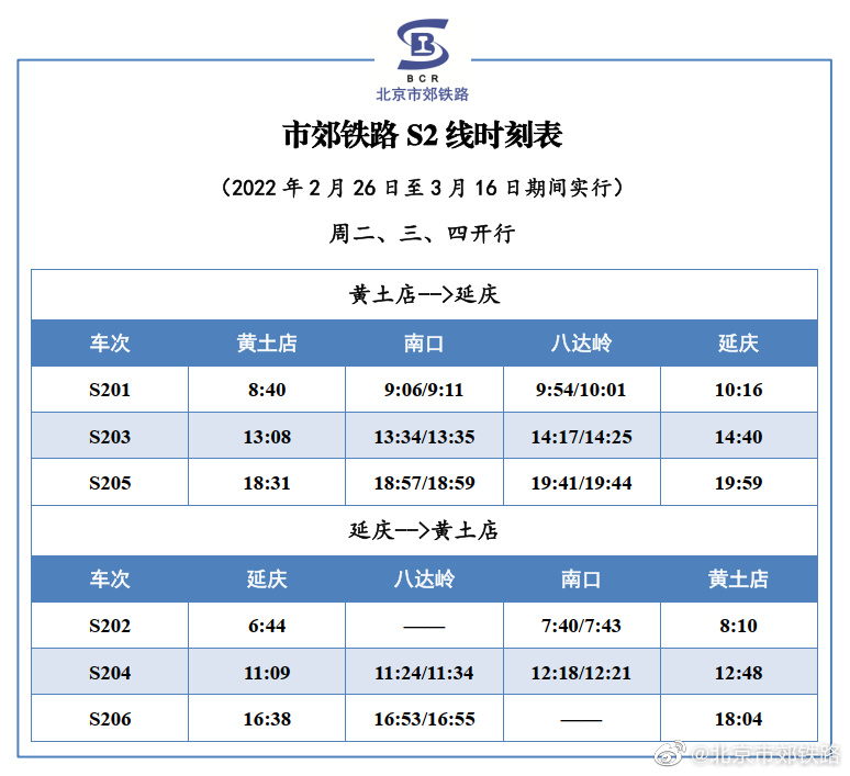 人民網(wǎng)北京2月25日電 據(jù)北京市郊鐵路官方微博消息,根據(jù)鐵路運(yùn)輸調(diào)整通知,2022年2月26日至3月16日, S2線恢復(fù)周二、三、四3對/日,周五、六、日、一及小長假7對/日的列車開行方案,列車開行時(shí)點(diǎn)無變化,具體列車時(shí)刻表如下所示。