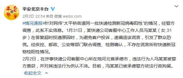 據(jù)北京豐臺公安分局官方微博消息,針對網(wǎng)上流傳“太平橋街道同一批快遞檢測新冠病毒陽性”的情況,經(jīng)警方調(diào)查,此系不實信息。1月31日,某快遞公司客服中心工作人員馮某某(女,31歲)在答復(fù)超時投遞原因時,為避免客戶投訴,遂編造該謊言,引發(fā)了群眾恐慌。經(jīng)疾控、郵政、公安等部門聯(lián)合調(diào)查、檢測確認,不存在謊言所稱快遞新冠物檢陽性情況。