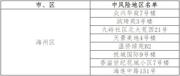 通告稱,根據(jù)國(guó)務(wù)院聯(lián)防聯(lián)控機(jī)制有關(guān)規(guī)定,經(jīng)綜合評(píng)估研判,市指揮部決定,自2022年3月6日0時(shí)起,將眾興華庭7號(hào)樓、潤(rùn)琦苑3號(hào)樓、九嶺社區(qū)北大荒西21號(hào)、天景美地4號(hào)樓、溫僑綠苑B2、悅城國(guó)際9號(hào)樓、香溢世紀(jì)花城小區(qū)7號(hào)樓、海連中路151號(hào)調(diào)整為中風(fēng)險(xiǎn)地區(qū),其他地區(qū)風(fēng)險(xiǎn)等級(jí)不變。