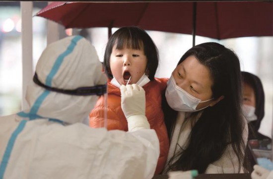 3月20日,在嘉興秀洲區(qū)新城街道核酸采樣點,市民們冒雨前來參加核酸檢測?,F場,有不少小朋友跟著家長參加檢測,面對和藹可親的醫(yī)護人員,小朋友們積極配合,一個個表現得特別勇敢。(馮玉坤)