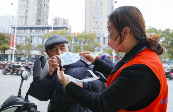 志愿者在街頭為群眾免費(fèi)發(fā)放口罩,宣傳防疫知識。張莉琳攝