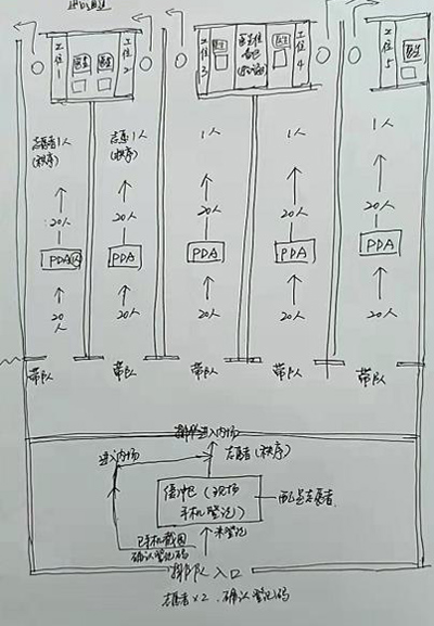 正如祁媛媛所說,靈感來源于實踐。靠著連日來在檢測一線工作的體驗,祁媛媛不斷摸索,反復(fù)思考,根據(jù)1-6個工位的不同組合,手繪了6張檢測流程圖,上面清晰地標(biāo)注著檢測的動線、每個環(huán)節(jié)以及對應(yīng)的功能和注意事項,從而能夠直觀地指導(dǎo)居村提升檢測效率,讓檢測如“流水線”般高效順暢。