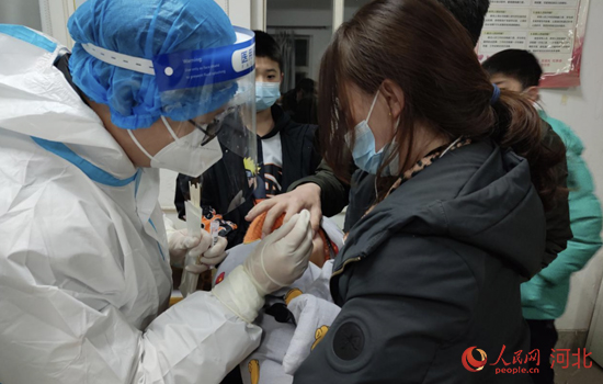 3月18日,海興縣小山鄉(xiāng)9個月大的寶寶被媽媽抱著接受核酸檢測。 梁妍婧攝