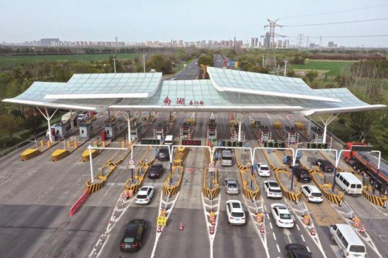 3月28日下午,在嘉興高速南湖收費站外廣場,防疫人員對來嘉車輛進行健康碼、行程卡的檢查,守好嘉興“南大門”。(趙穎碩)