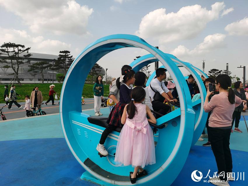 在這個(gè)“熊貓火炬手”的對面,一條“體育星光大道”綿延鋪展而來。在這條路上,每隔一段距離就會(huì)有一組圖標(biāo)和漢字,標(biāo)注著某一項(xiàng)體育運(yùn)動(dòng),如網(wǎng)球、跳水等。這個(gè)構(gòu)思,從整體上詮釋了大運(yùn)會(huì)蘊(yùn)含的眾多體育項(xiàng)目,也能讓那些偏好某個(gè)項(xiàng)目的游客找到喜歡的體育坐標(biāo)點(diǎn),提升起體育游園的氣氛。