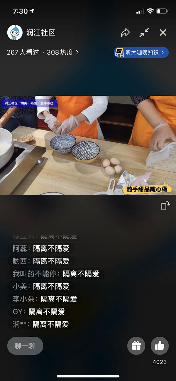 在這個特殊的“戰(zhàn)疫”時(shí)刻,潤江社區(qū)依舊在3月29日-4月3日6天時(shí)間里陸續(xù)推出了包括心理疏導(dǎo)課程、健身指導(dǎo)課程、烘焙分享、家庭收納、親子共讀和感悟分享在內(nèi)的直播內(nèi)容。截至目前,“小杜直播間”已經(jīng)吸引了社區(qū)內(nèi)近1500人次觀看,這些直播內(nèi)容貼合了社區(qū)居民的需求,從各方面為居民緩解居家的焦慮、豐富居民的居家生活。