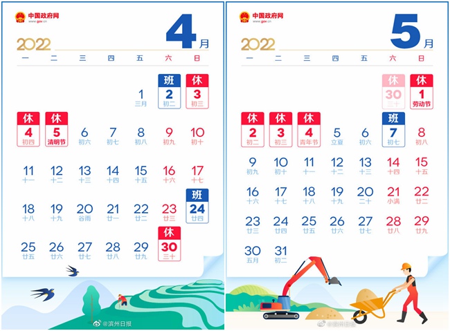 根據(jù)國務(wù)院辦公廳通知精神,現(xiàn)將2022年勞動(dòng)節(jié)放假安排通知如下: 4月30日(星期六)至5月4日(星期三)放假調(diào)休,共5天。4月24日(星期日)、5月7日(星期六)上班。 請(qǐng)廣大市民提前安排好工作生活,節(jié)日期間注意安全,減少人員聚集,加強(qiáng)個(gè)人防護(hù),度過一個(gè)歡樂、祥和的節(jié)日假期。