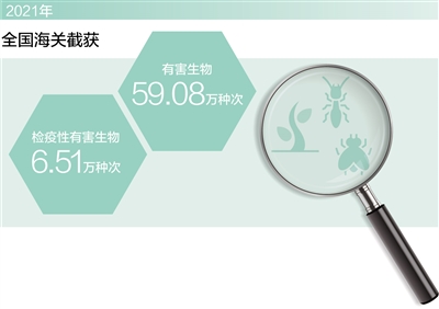 據統(tǒng)計,2021年,全國海關截獲有害生物59.08萬種次、檢疫性有害生物6.51萬種次,首次檢出致死粒線蟲、鈴蘭短體線蟲、北美齒小蠹等危險性有害生物,有效防止紅火蟻、高致病性禽流感等重大動植物疫情疫病傳入,退回、銷毀不合格農產品584批。