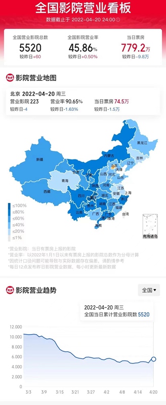 據(jù)國內(nèi)某專業(yè)電影數(shù)據(jù)平臺,4月20日全國影院營業(yè)率45.86%,營業(yè)影院5520家,較上日增加60家,大盤票房779.2萬元。截至4月20日23時,浙江省單日票房(4月20日)約為64萬元,總出票17678張,總場次13722場,平均票價36元。