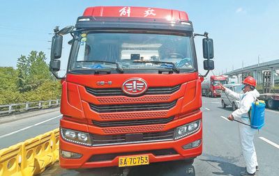 4月21日,郭輝駕駛貨車返回南京后,防疫工作人員對貨車進行消毒。本報記者 姚雪青攝