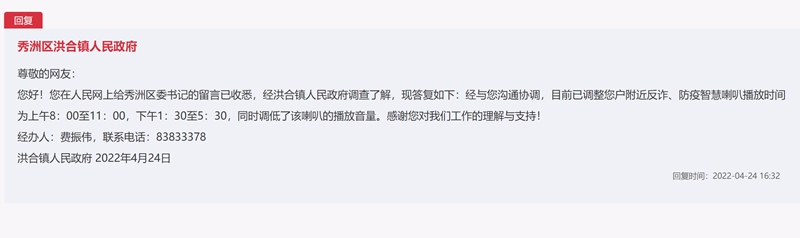 秀洲區(qū)洪合鎮(zhèn)人民政府對此高度重視,并于4月24日進(jìn)行了回應(yīng),并回復(fù)稱,經(jīng)洪合鎮(zhèn)人民政府調(diào)查了解,已與徐女士進(jìn)行了溝通協(xié)調(diào),目前已將徐女士所住小區(qū)附近的反詐、防疫智慧喇叭的播放時(shí)間調(diào)整為上午8:00至11:00,以及下午1:30至5:30,同時(shí)調(diào)低了該喇叭的播放音量。