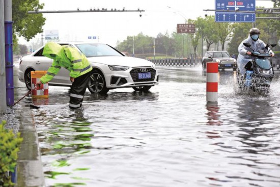 4月26日,在嘉興市區(qū)中山西路,因短時暴雨造成部分路段臨時積水,來自周邊企業(yè)的志愿者堅守在大雨中清除路面積水,保障過往車輛及行人的交通安全。(馮玉坤)