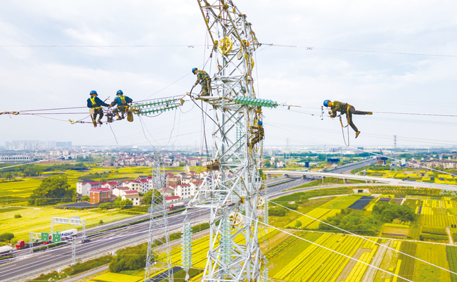 4月25日,金華市婺城區(qū)金蘭快速路竹馬鄉(xiāng)段道路旁,電力工人正在“仙橋一鹿田變”110kV線路鐵塔上開(kāi)展高空架線作業(yè)。(胡肖飛)