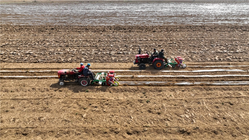 朔城區(qū)南榆林鄉(xiāng)青鐘村玉米核心區(qū)播種現(xiàn)場(chǎng),應(yīng)用了膜側(cè)播種技術(shù)的播種機(jī)在田間播種作業(yè)。高文武 攝